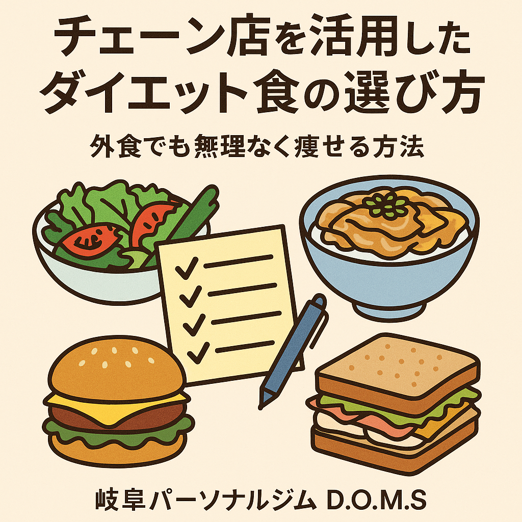 「仕事が忙しくて自炊できない」「外食が多いけどダイエットしたい」――そんな方にとって、チェーン店は強い味方です。多くのチェーン店ではカロリーや栄養情報が公開されており、うまく選べば減量中でも栄養バランスの取れた食事が可能です。本記事では『チェーン店で選ぶべきダイエット食の選び方』を、岐阜パーソナルジムD.O.M.Sが具体例とともに徹底解説します。